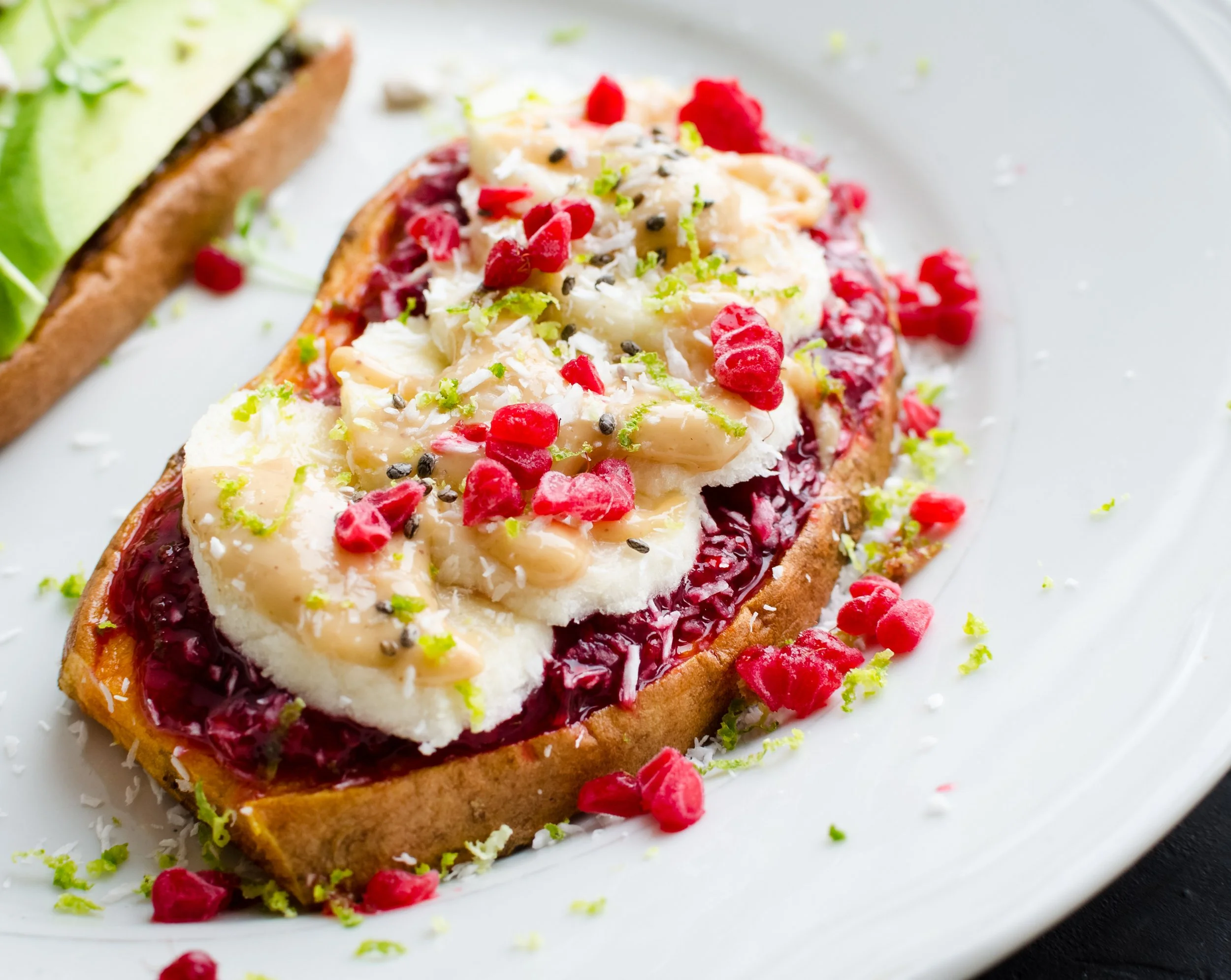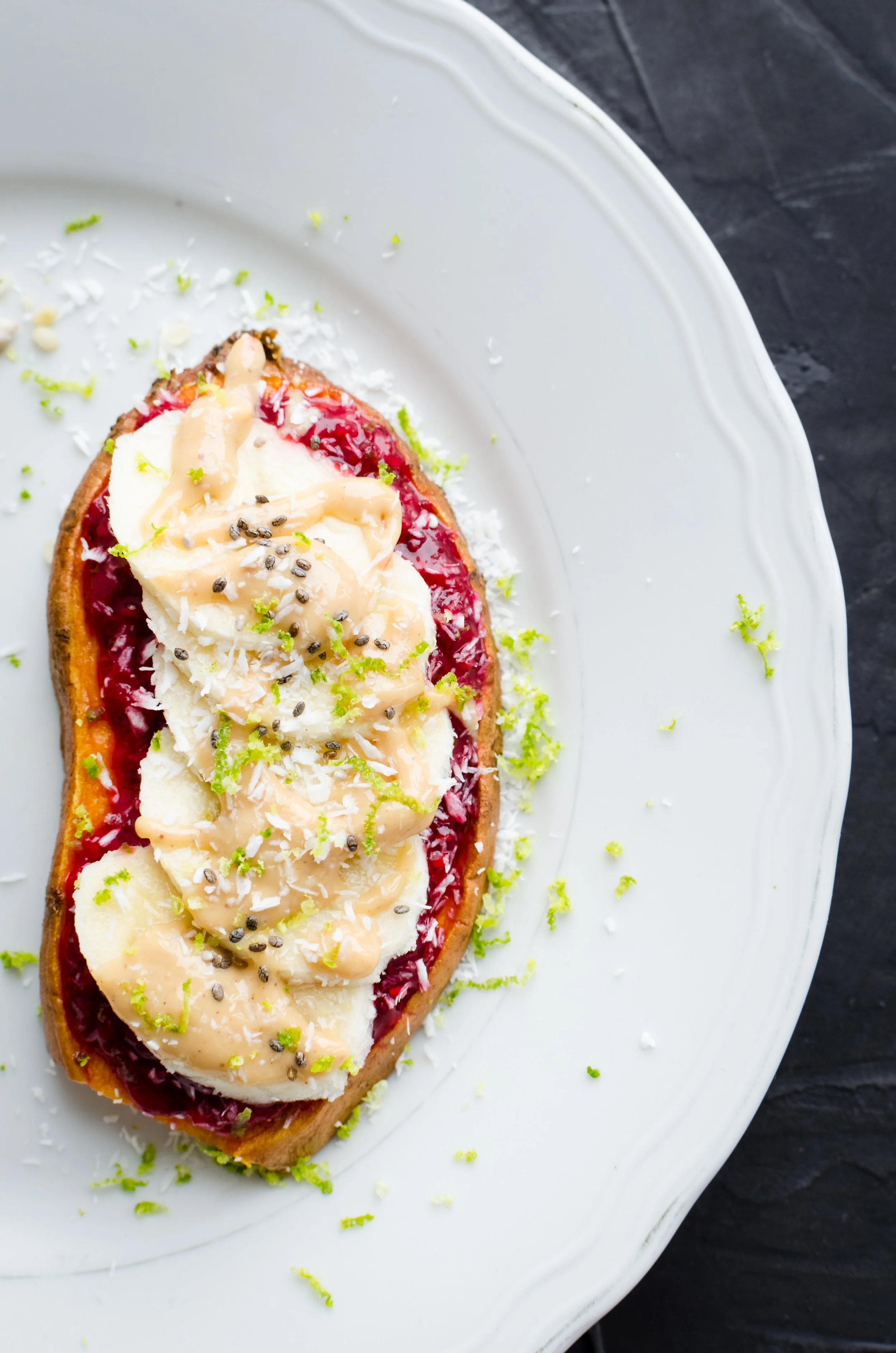 3. Place the sweet potato slices on the baking sheet and bake for 20-25 minutes, flipping halfway, until tender but firm enough to hold toppings. (Alternatively, toast each slice in a toaster on high for 2-3 rounds until cooked through and slightly crispy.)